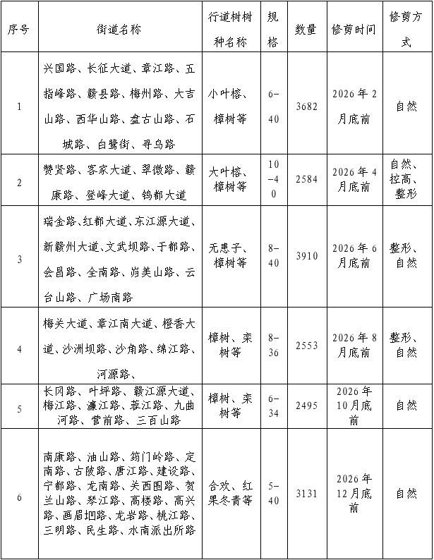 章江新区针对兴国路、长征大道、章江路等65条路段共计18355株行道树开展修剪养护计划。1-2月率先对兴国路、长征大道等6条主干道开展整形修剪与死树清理,后续逐月推进赞贤路、瑞金路、梅关大道等路段养护,11-12月重点完成南康路、信丰路等零星路段及小游园的乔木与古树名木修剪。