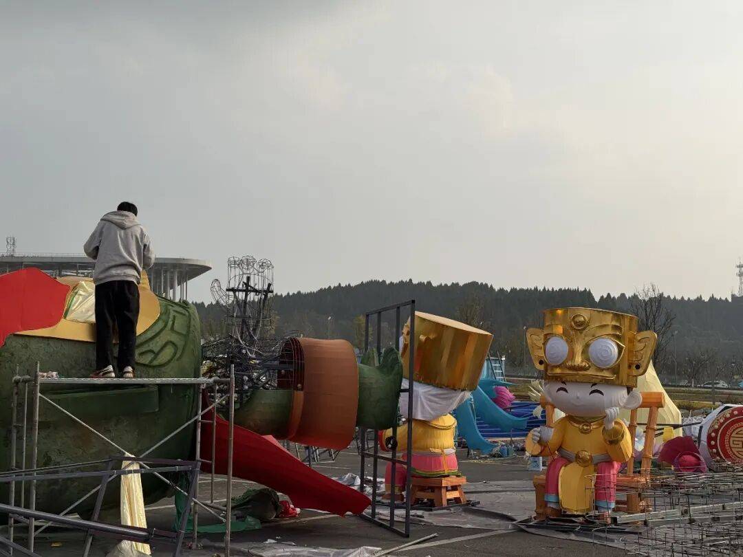 施工现场,焊花点点,光影交错。200余名工匠正轮班进行焊接、美工与裱糊,为大型灯组披上流光溢彩的“新衣”。一座座巨型钢架拔地而起,彩灯轮廓逐渐清晰,一场融合古蜀神韵与现代光影的艺术盛宴正徐徐揭开面纱。